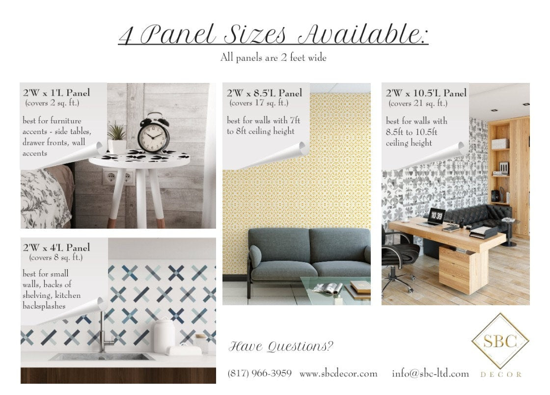 • Panel 2'W x 1'L (covers 2 sq ft.) – our version of a 'sample swatch' - an easy solution to figuring out how many panels your surface will need; simply apply and use as your measuring guide!